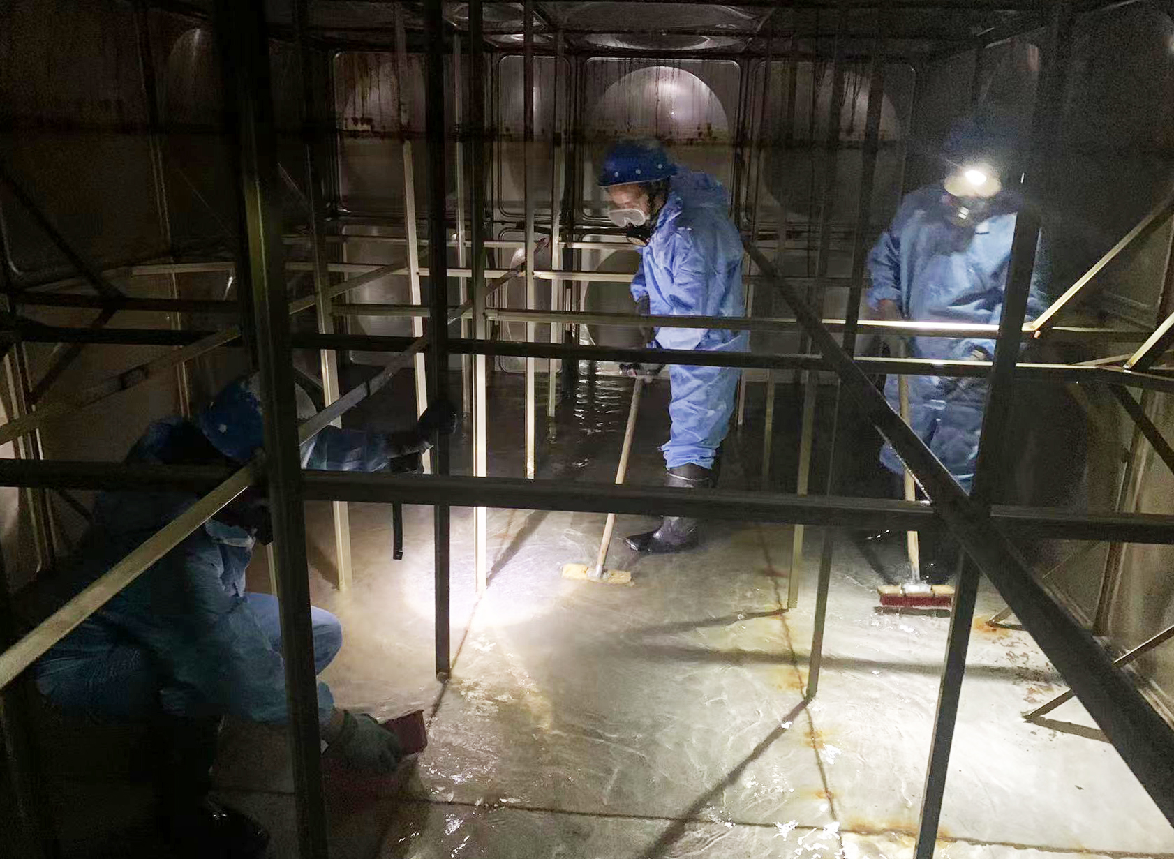 圖:泵房設(shè)備檢修現(xiàn)場(chǎng) 很多人認(rèn)為日常巡檢就是“走一圈”,殊不知,這看似簡(jiǎn)單的工作背后,藏著供水人的別樣匠心,供水“鏈條”環(huán)環(huán)相扣,日常巡檢便是其中重要一環(huán)。一次氣管漏氣被漏檢,可能引起隔膜泵運(yùn)行不穩(wěn)定;一處隱患點(diǎn)被遺漏,可能導(dǎo)致設(shè)備停運(yùn);一組濕度數(shù)據(jù)被忽視,可能造成設(shè)備被濕度過(guò)高的空氣銹蝕……類似這樣的巡檢細(xì)節(jié)不勝枚舉,因此,著眼于細(xì)節(jié)是巡檢員們必備的品質(zhì),及時(shí)發(fā)現(xiàn)、分析、解決問(wèn)題,讓每一臺(tái)設(shè)備處于良好的運(yùn)行狀態(tài),便是維修人員最大的底氣。 錯(cuò)峰作業(yè),密切配合保水質(zhì) 清水池是水廠成品水的儲(chǔ)存水箱,承擔(dān)著調(diào)蓄、穩(wěn)壓、消毒的重要作用,能夠?qū)崿F(xiàn)“高峰多送,低峰多貯”的調(diào)節(jié)功能,因此清水池的“健康”與供水水質(zhì)密切相關(guān)。按前期規(guī)劃部署,公司利用五一假期完成了三棵樹增壓泵站清水池維護(hù)清洗任務(wù)。為順利完成清洗任務(wù),制水部、機(jī)電設(shè)備部、調(diào)度中心在前期共同制定施工方案,明確各自任務(wù)。清洗現(xiàn)場(chǎng),制水部與機(jī)電設(shè)備部密切配合,清洗過(guò)程井然有序,三棵樹增壓泵站清水池維護(hù)清洗任務(wù)順利完成為洋河新區(qū)及周邊鄉(xiāng)鎮(zhèn)供水安全提供了堅(jiān)實(shí)的保障。 當(dāng)夜幕降臨,城市沉靜下來(lái),居民用水量變小之時(shí),正是供水人執(zhí)行特定作業(yè)任務(wù)的最好時(shí)機(jī)。當(dāng)面對(duì)泵房只有一個(gè)水箱進(jìn)行供水時(shí),水箱清洗員就需要在深夜時(shí)進(jìn)行清洗作業(yè),待排水、通風(fēng)換氣、清洗、消毒等一系列工作全部完成,水箱清洗員也將迎來(lái)黎明前的第一縷陽(yáng)光。在清水河至蘇州路路段,建管中心、管網(wǎng)部、制水部等幾個(gè)部門經(jīng)過(guò)十幾天通宵達(dá)旦的緊張施工,終于完成了該路段供水管道沖洗工作……