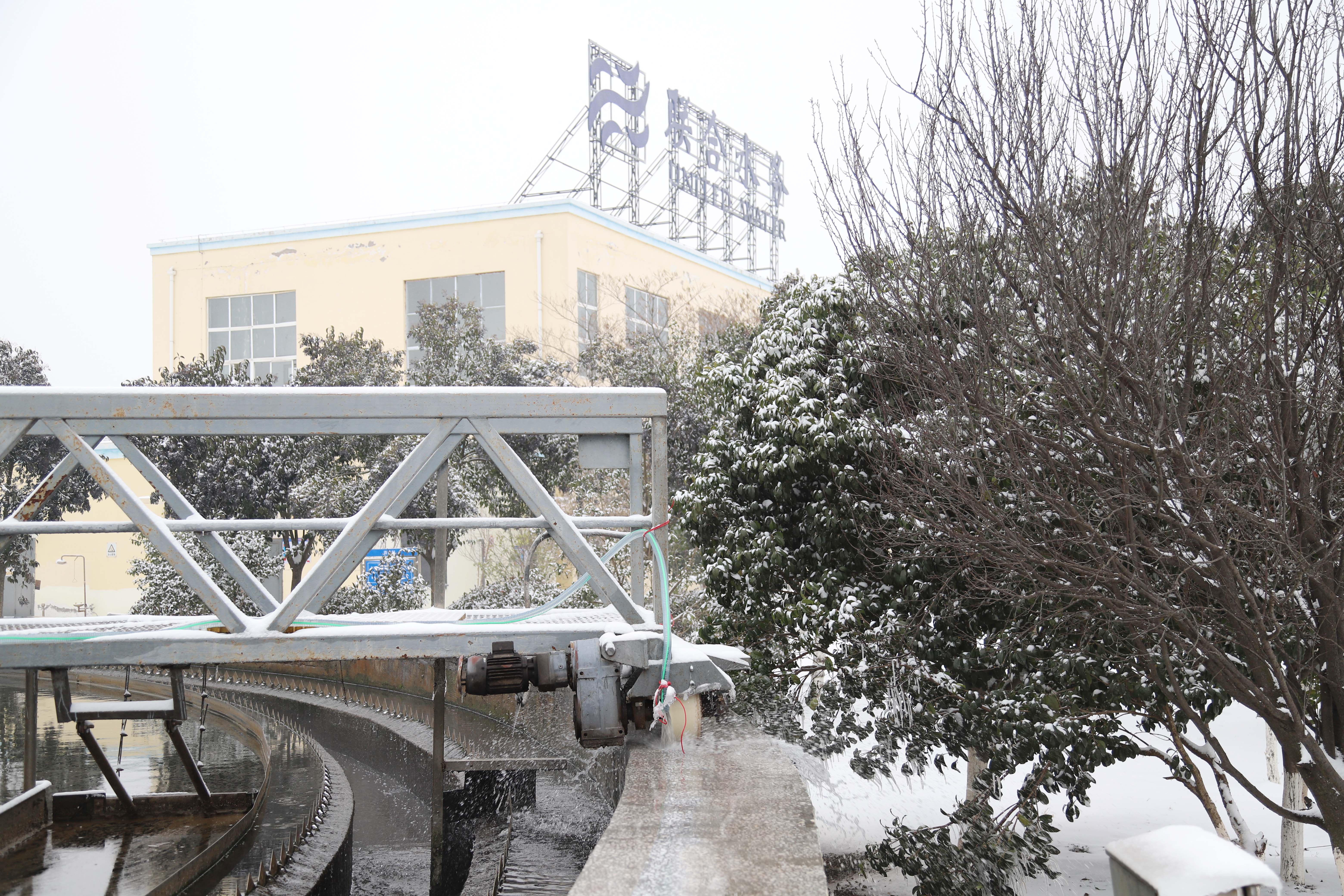 污水處理工作不僅關系著生態環境,也是關系著千家萬戶的民生大事,寒潮天氣下,隨州公司生產人員冒著風雪進行重點地巡檢,通過巡檢觀察污水處理廠各工藝單元的感官現象和指標,初步判斷水質的變化和運行是否正常、穩定,重點設備是否正常運行。在巡檢的過程中,生產人員發現一期四座二沉池下方輪子出現打滑空轉,二沉池運轉停止的情況。雪落在行走軌道上,被行走輪壓實后,形成雪層,造成行走輪的打滑,使刮泥機長時間在一個位置運行,池底的污泥無法全部排出,造成工藝運行的異常,需要及時清理干凈軌道表面的冰層。發現問題后,生產各部門緊急召開臨時會議,制定解決方案,最終決定安裝水泵,從池子抽水澆注在軌上道,保障軌道正常運行。