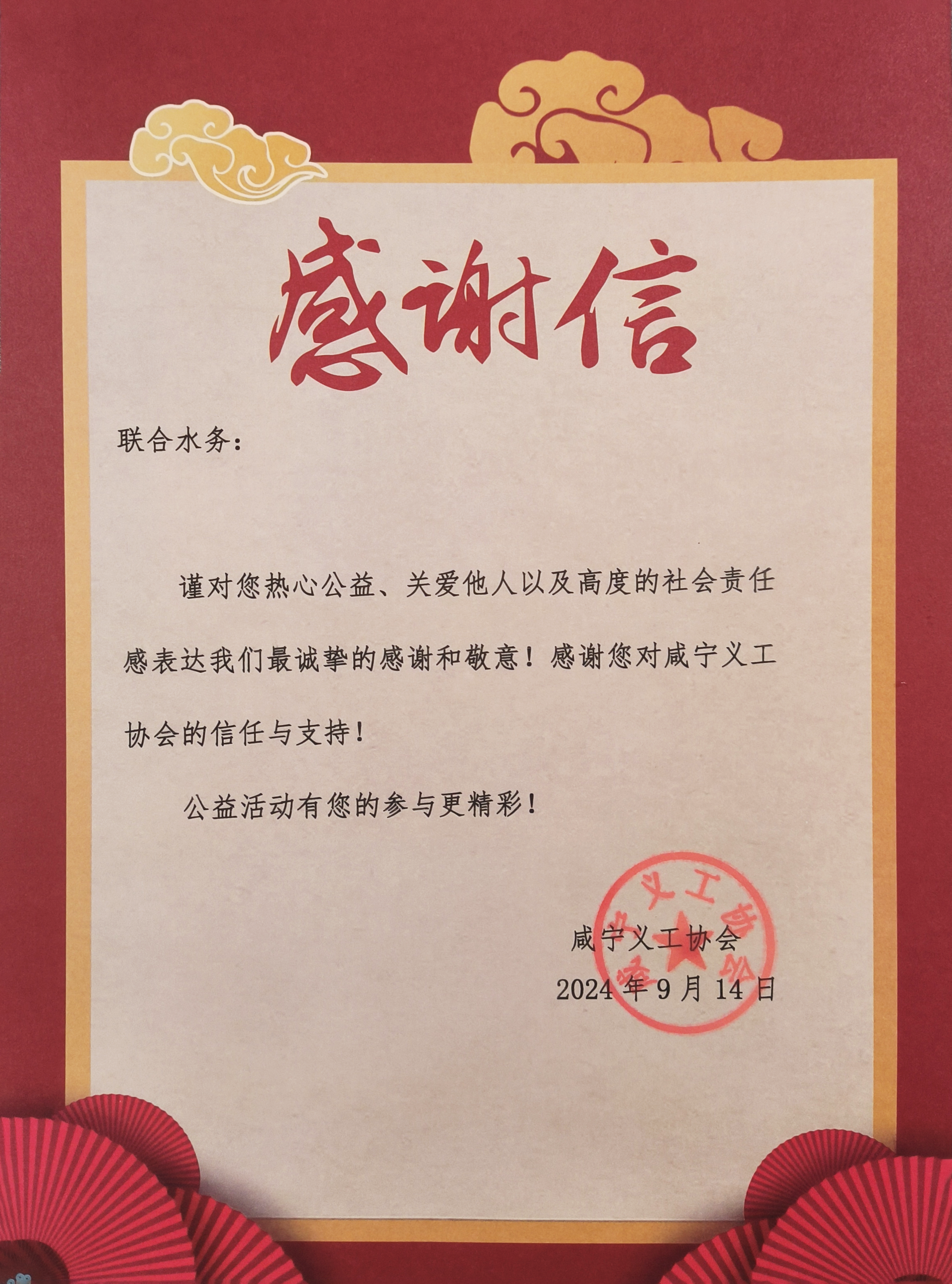 近日,咸寧聯合水務有限公司收到一封來自咸寧義工協會送來的感謝信,信中對我公司積極助力公益活動、關愛他人以及高度的社會責任感表達誠摯的感謝和敬意!