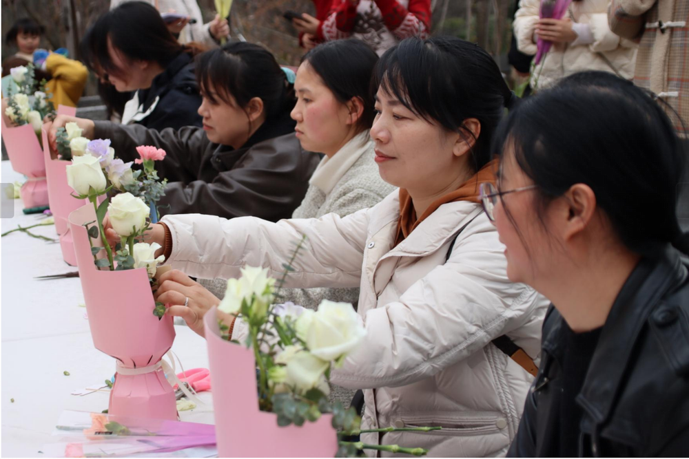 指尖綻放花樣年華 插花工坊里,花藝?yán)蠋熞浴胺既A悅己”為主題演繹創(chuàng)意美學(xué)。活動現(xiàn)場花香撲鼻,女教職工們在歡聲笑語中,暫時忘卻工作和生活壓力,沉浸在花藝創(chuàng)作帶來的寧靜與愉悅之中。工會主席林立輕撫親手制作的花束禮盒:“平日總在傾聽他人需求,今天終于能專注呵護(hù)內(nèi)心的美好。”