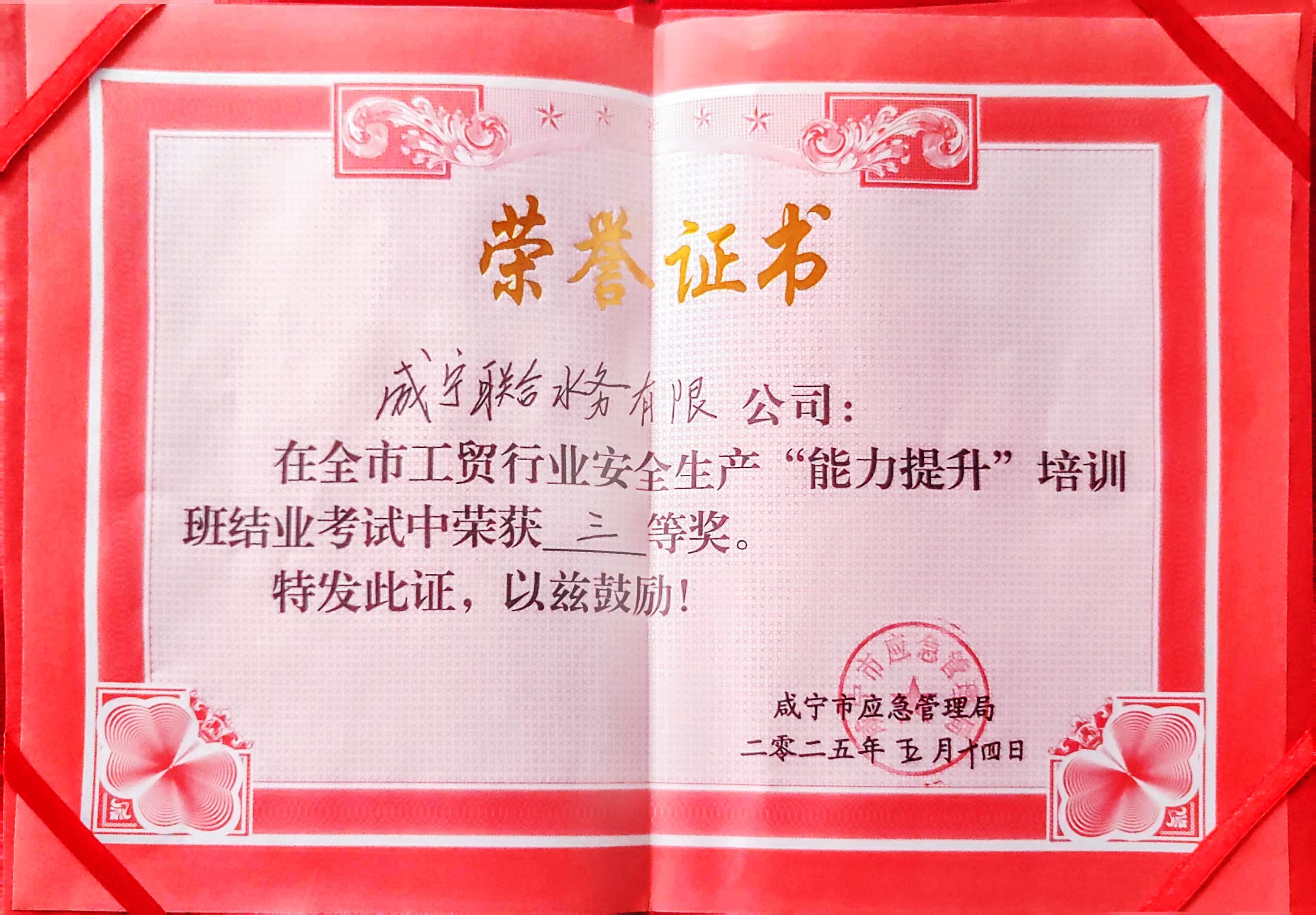 喜報|咸寧聯合水務員工榮獲咸寧市工貿行業安全生產“能力提升”培訓班結業考試三等獎
