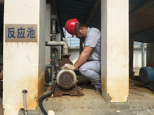 圖2:機電人員在檢修設備 用雙腳丈量熾熱的土地,確保生產安全 生產部水區運行工24小時不間斷對廠內各個工藝段污水指標、設備進行巡查。烈日炎炎,他們用雙腳丈量每一寸熾熱的土地,他們的身影不停穿梭在集水池、初沉池、水解酸化池、好氧池、二沉池、終沉池、芬頓池之間。盡管豆大的汗珠在臉上肆無忌憚的橫流,他們依堅守在一線,一遍遍巡查,一旦發現問題,立即上報。 嚴控工藝,根據污水指標,嚴格進行生產調控。根據進水情況,調整前物化段加藥量;根據溶解氧量,調整鼓風機出風量;根據終沉池出水水質,調整芬頓加藥量。正是因為嚴謹的工作作風及對工藝的嚴格調控,才保證了荊州項目公司出水始終達標排放。
