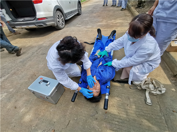 圖2:應(yīng)急演練現(xiàn)場--醫(yī)護人員查看傷員情況 總指揮迅即趕到事故地點統(tǒng)籌指揮,應(yīng)急小組多措并舉,疏散現(xiàn)場閑雜人員、布置警戒線、通知救援小組展開救護工作、撥打120急救電話,各項工作緊張而有序開展。救援隊長了解事故大致情況后,安排人員在現(xiàn)場安裝大功率通風設(shè)備進行通風處理,并開展初期救援,2分鐘后,公司專業(yè)救援人員佩戴便攜式防毒面具、安全帶,攜帶檢測儀器、對講機,連接救生索,入池檢測氣體濃度,評估下池救援的可行性。在確認可以施救的情況下,將傷員轉(zhuǎn)移至池外通風空曠處,隨即按標準心肺復(fù)蘇手法實施搶救,直至120救護車趕到。專業(yè)醫(yī)護人員查看傷員情況后將其轉(zhuǎn)移至救護車上,送往醫(yī)院搶救治療。至此,經(jīng)過精心策劃、周密安排的應(yīng)急演練圓滿落下帷幕。