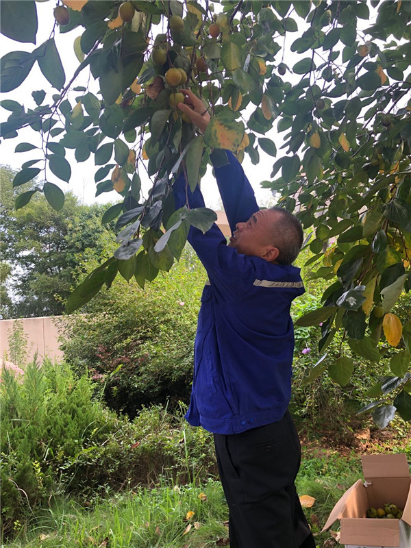 在鄭總的一聲令下,今年的“摘柿節”正式拉開序幕。也許是中午加餐了的原因,大家都是干勁十足。一開始都是踮起腳尖圍著被柿子壓彎的樹枝摘,很快踮起腳尖能夠得著的柿子都被摘干凈了,但馬上就有人找來了兩張椅子墊著摘。一個人摘,一個人抱著紙箱接著,生怕碰壞了一丁點兒,配合得極其融洽。沒過一會兒,墊著的椅子也不夠高了,這個時候就需要一兩名“勇士”了。張廠長和童哥自靠奮勇爬到樹上,瘋狂地收割著今年的“成果”。樹下的人也沒閑著,舉起長長的網兜接著剛摘下來圓鼓鼓的柿子。采摘進行得非常順利,陽光下,大家一個個都笑得合不攏嘴。有人上樹,就有人接著柿子,有人爬梯子就有人扶,有柿子掉地上,立馬就有人去撿。一個多小時的時間,竟然摘了整整五大箱。柿子樹下一片祥和的畫面,不身在其中很難體會到這種美好!