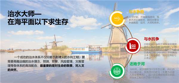 特殊的地理水文環境造就了荷蘭特殊的治水歷史,12世紀起填海造陸,開始了長達7個世紀的與水爭地的浩大工程。由于飽受水患影響,20世紀起,荷蘭進入水利工程快速發展期,在此期間誕生了號稱“現代世界第七大奇跡”的荷蘭三角洲工程及南海工程。聲勢浩大的與水抗爭,并沒有從真正意義上解決荷蘭的水患問題,特別是1995年的洪災,荷蘭受災面積170平方公里,25萬人口遷徙,這次將荷蘭防洪治水工程引向了另一個方向-還地于河(Room for the River),開啟了人水和諧的新篇章。