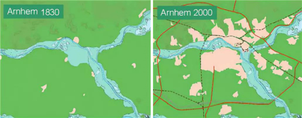 奈梅亨(Nijmegen)退堤工程位置位于瓦爾河(Waal River),是河流從德國至荷蘭境內后的關鍵節點,敏感性極高,城市發展不斷擠壓河道生存空間,加劇了洪水與城市之間的緊張關系。