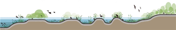 棲息地營造與恢復也是水生態修復的重要目的。通過微地形營造及草-灌木-喬木小生境的設計,可有效實現生物多樣性的恢復及棲息地的打造。如涉禽類主要于水深10-23 cm的空間內活動攝食,而游禽類主要于水深50-200 cm范圍內游憩活動,水深30 cm范圍內覓食,而不同的植被可為其提供產卵、棲息的隱蔽空間。