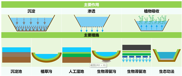 其主要采用自然凈化過程,包括沉淀、滲透與植物吸收等作用,主要工程元素包含沉淀池、植草溝、人工濕地、生物滯留溝、生物滯留池及生態工法駁岸等等,同時也包含多種綠色建筑、公共教育空間等配套措施。