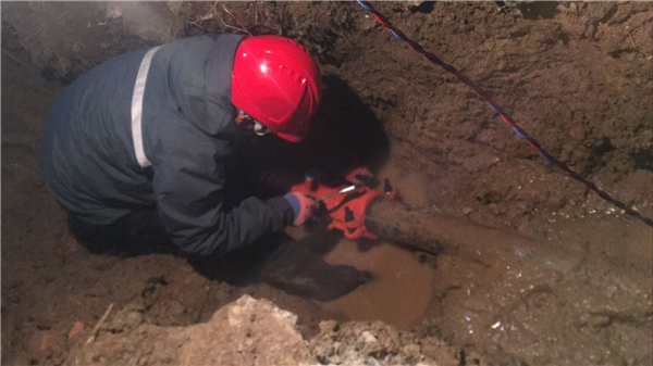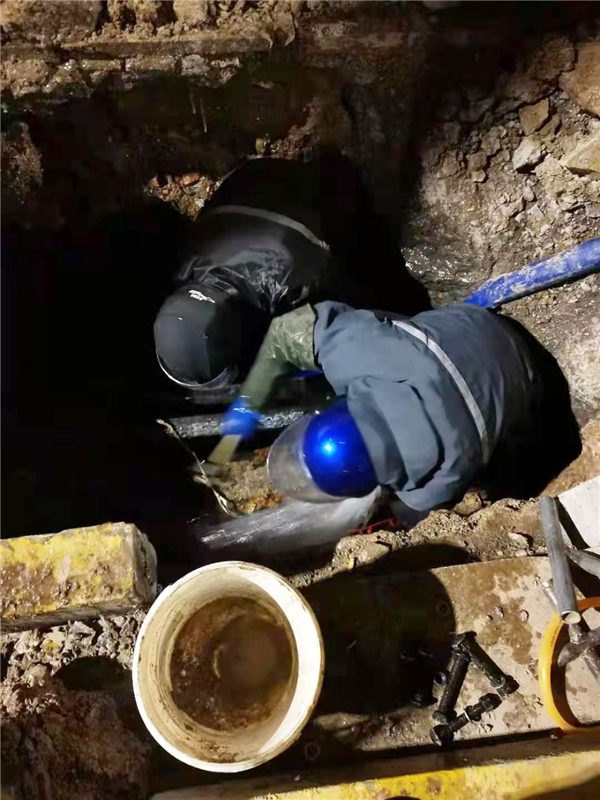 2021年1月6日晚17:00時,公司管網部接到報修通知,主城區幸福路與馬陵路交叉口發現一處爆管,地面積水嚴重,且已有結冰現象,需要迅速處理。黨員先鋒搶修隊維修員韓江此時剛剛從外面維修回來,聽到這個消息,二話不說,立即趕往現場,沒有片刻停歇。因正值下班高峰期,路面車流不斷,不便展開維修工作,但路面積水成冰已嚴重威脅到車輛行人安全。韓江說,搶修保供水是供水人的職責,保護人民群眾人身安全更是我作為一名共產黨員的神圣職責,困難再大我們也必須克服,搶修刻不容緩。他緊急向領導匯報,請求增援。首先開展路面積水積冰清理工作,保障車輛行人安全通過,直到19:00,才正式開展維修工作。此時室外溫度-8℃,風漸大。開槽確定漏點,爆管區域硬化路面厚度達1.2米,人工開槽難度太大,調來挖掘機輔助工作,也并不順利,水管上部有兩條不明深度的電纜交叉通過。時間到了22:30分,終于開挖完畢,兩條50電纜保護完好,但是給水管自身狀況卻不容樂觀:原外徑82水泥管與73制式鑄鐵管難以實現無縫連接,現場人員試了多種辦法,均達不到預期效果。