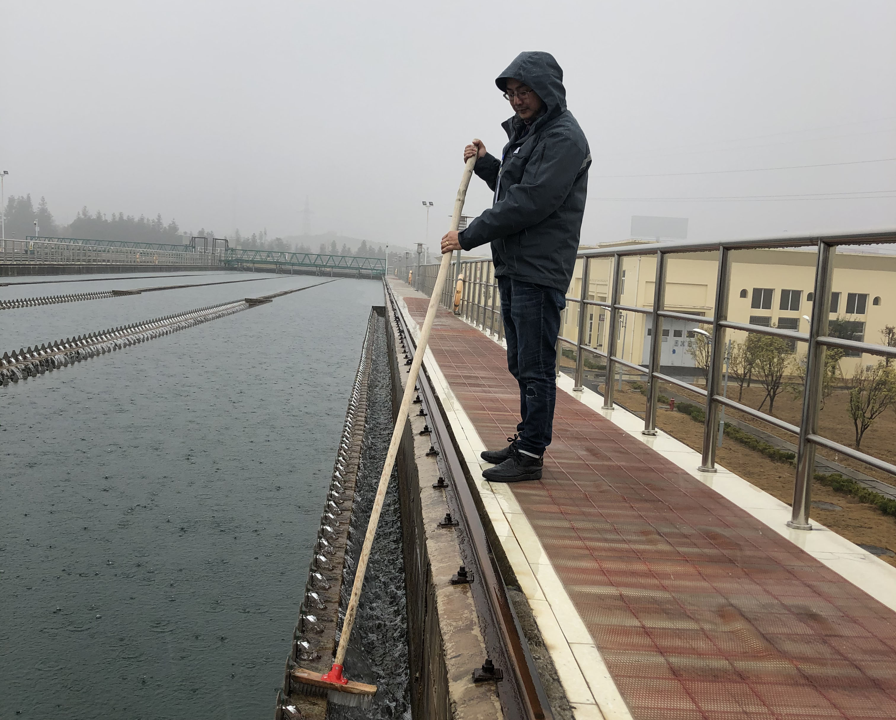 黃智淵正在檢查機電設備 在王英水廠的平流沉淀池上,陳鋒冒著大雨正在進行清理工作。新年第一天,天公不作美,下起了磅礴大雨,但是為了保障佳節期間供水生產無患,咸寧聯合水務制水部的一線員工們放棄了在家過節的機會,冒雨堅守在制水生產線上,時刻保障城市供水無礙。