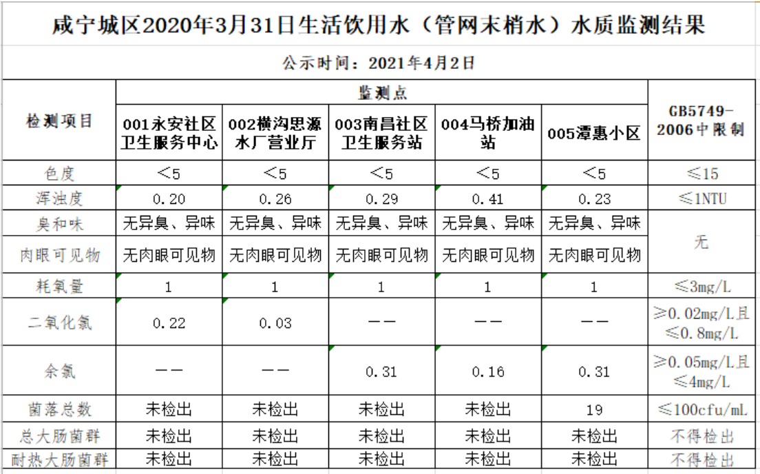 除了省城市供水水質監測網的季度抽查,咸寧市衛計委、市住建局和市生態環境局,分別作為市級主管部門對咸寧聯合水務供水水質進行月檢、半月檢及日檢。市疾控中心每月對水源水、出廠水水質進行常規42項檢測,每天對管網末梢水水質進行7項指標監測,其結果在咸寧市衛計委網站公開發布;市住建局每半年對各出廠水水質進行常規42項督查;市生態環境局對各水廠飲用水水源水質進行實時在線監測。