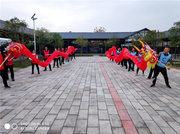 圖/ “鼓動人心”活動現(xiàn)場 最后一個項目是“龍騰盛世”。所有人齊心協(xié)力將零件組裝成一條活靈活現(xiàn)的龍,并在教練的指導下完成龍騰四海、盤龍云海及游龍戲水三個動作。這是一個大型創(chuàng)作類項目,趣味性和團隊合作性極強。大家各司其職,制作龍骨、畫龍鱗、粘龍頭龍尾,不到一刻鐘的時間,兩條游龍就制作完成。在舞龍環(huán)節(jié),大家專心聽、用心舞,兩隊的舞龍動作都得到了教練的高度贊揚。最后,在教練“風水越來越順、生活越來越好”的祝福中結(jié)束了愉快而充實的團建拓展活動。
